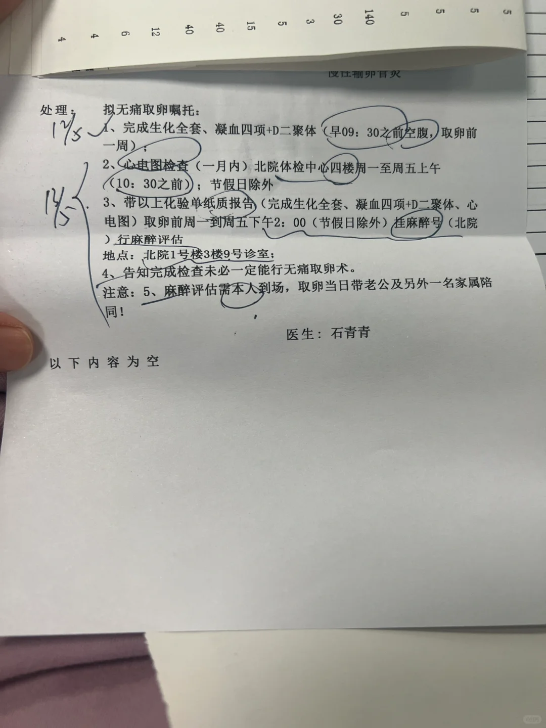 今天卵泡12了,做b超医生直接问要不要做无痛取卵。要做就直接开单子,让5.12日来医院抽血(需空腹),周末麻醉科不上班,所以5.13周一再来做心电图检查及麻醉评估,抽血费用今天已经交过了